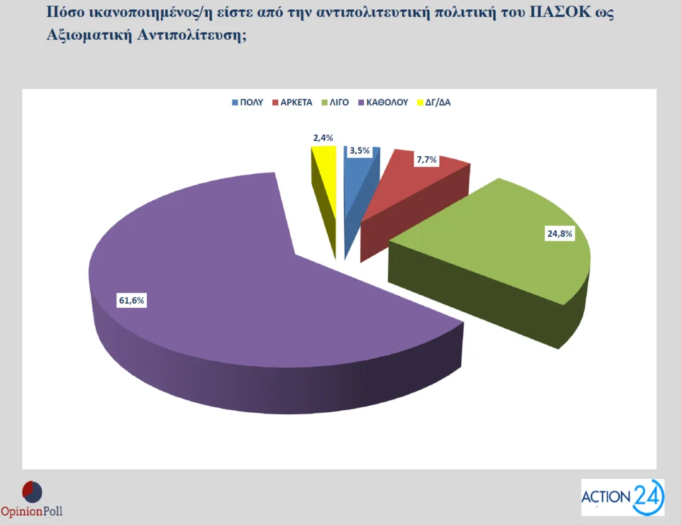 Το 52,3% του δείγματος δηλώνει ικανοποιημένο από λίγο ως πολύ από τη συνολική επίδοση της κυβέρνησης σε όλη τη θητεία της μέχρι σήμερα και το 47% καθόλου. Για την αντιπολιτευτική πολιτική του ΠΑΣΟΚ δηλώνει ικανοποιημένο το 36% και το 61,6% καθόλου.