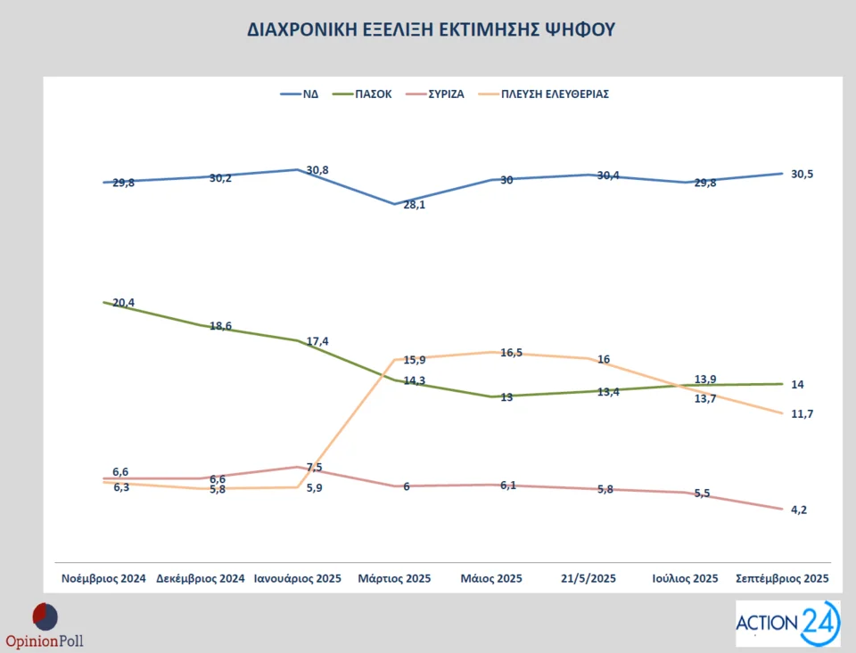 Στην εκτίμηση ψήφου η ΝΔ καταγράφεται στο 30,5% επιστρέφοντας στα επίπεδα του Μαΐου και του Ιανουαρίου του 2025, με βάση τις προηγούμενες μετρήσεις της ίδιας εταιρείας, με το ΠΑΣΟΚ να ακολουθεί με 14%, την Πλεύση Ελευθερίας με 11,7%, την Ελληνική Λύση με 11,5%, το ΚΚΕ 7,4%, η Φωνή Λογικής 4,3%, ο ΣΥΡΙΖΑ 4,2%, το ΜΕΡΑ25 3,4%, το Κίνημα Δημοκρατίας 2,7%, η Νίκη 2,4%, η Νέα Αριστερά 1,6% και οι Σπαρτιάτες με 1,3%.