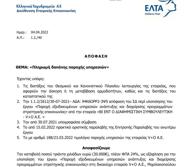 Στο ίδιο πνεύμα ήταν και οι απευθείας αναθέσεις των ΕΛΤΑ στην «επίσημη» διαφημιστική εταιρεία του Μαξίμου, την V+O, η οποία στήριξε και υπέθαλψε ως γνωστόν την Ομάδα Αλήθειας. Υπολογίζεται πως η εν λόγω εταιρεία έχει εισπράξει τουλάχιστον 250.000 ευρώ με απευθείας αναθέσεις και με την αιτιολογία της παροχής «εξειδικευμένων υπηρεσιών ανάπτυξης και διαχείρισης